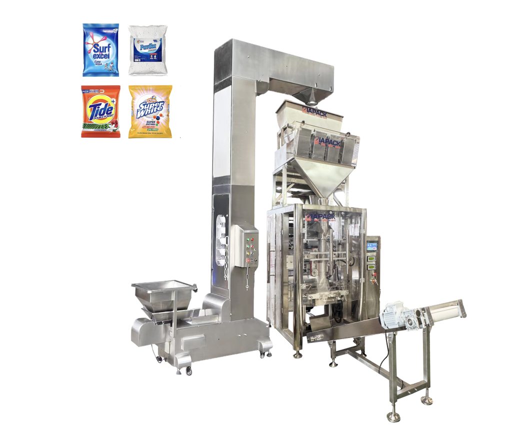 Mesin unit ini didesain khusus untuk mengemas produk butiran seperti beras, kacang, deterjen, bubuk, gula, millet, dan sebagainya. Seluruh badan mesin terbuat dari SUS304. Termasuk mesin pengisian dan penimbangan produk, mesin penyegel pembentuk kantong VFFS, satu set platform untuk mesin penimbang, dan konveyor keluaran untuk memindahkan kantong yang sudah jadi.