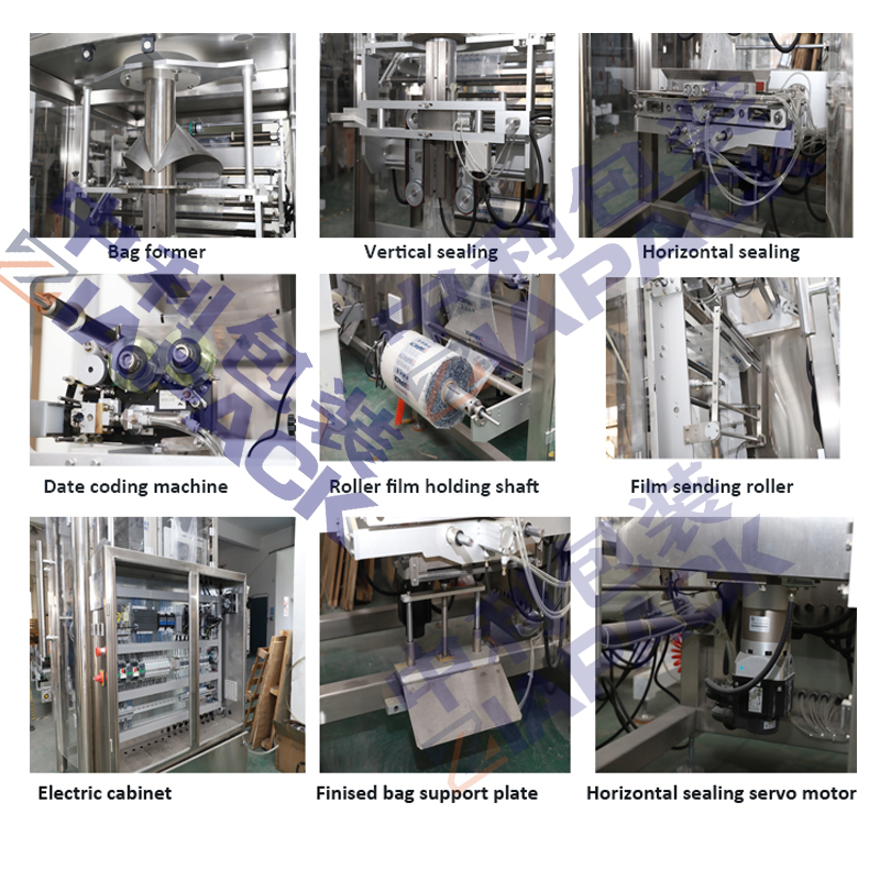 Mesin pengemasan ini mengadopsi motor servo impor untuk umpan film dan antarmuka manusia-mesin menggunakan layar sentuh canggih. Pengoperasian lebih sederhana dan lebih nyaman. Semua komponen mengadopsi merek terkenal internasional, PLC adalah SIEMENS, motor servo adalah PANASONIC, layar sentuh adalah SIEMENS, silinder dan katup udara adalah SMC. bagian yang kontak dengan bahan kabinet kontrol rangka utama terbuat dari stainless steel304
