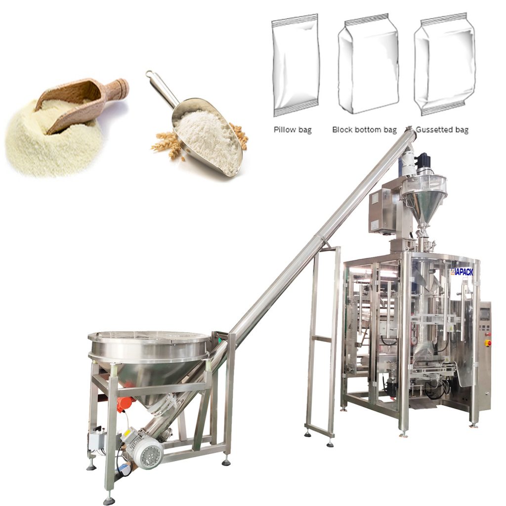 Unit mesin ini termasuk satu set ZL1100 tas vertikal yang membentuk mesin penyegel pengisi dan satu set mesin pengukur auger ZL2000. Seluruh unit mesin dapat mencapai pembuatan tas otomatis, penimbangan produk, penyegelan pengisian produk, dan kode tanggal. Banyak digunakan untuk mengemas tepung terigu, kopi bubuk dan susu bubuk dan produk bubuk lainnya.
