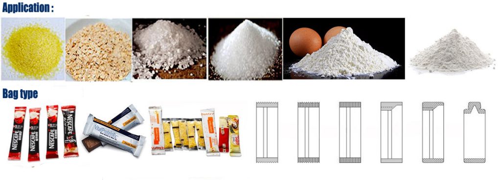 Mesin ini terutama digunakan untuk mengemas produk bubuk: seperti bubuk susu, bubuk teh susu, bubuk kopi, rempah-rempah, bubuk kari, bubuk protein, bumbu, bubuk herbal, produk bubuk kimia dan medis.