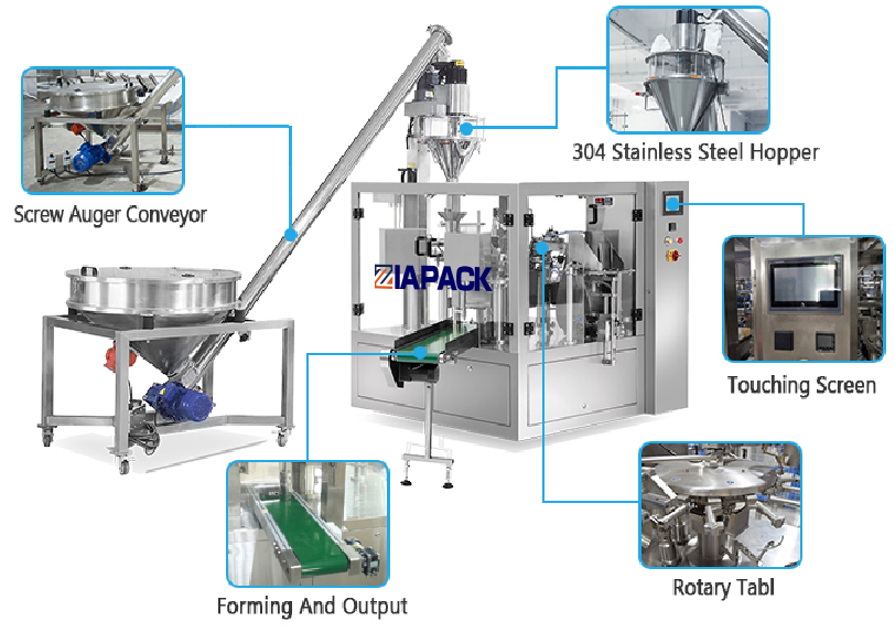 Dilengkapi dengan Augur Filler dan Screw Elevator, itu secara luas diterapkan untuk kemasan bubuk, seperti bubuk deterjen, susu bubuk, tepung, rempah-rempah, bubuk coco, kopi bubuk, dan sebagainya.