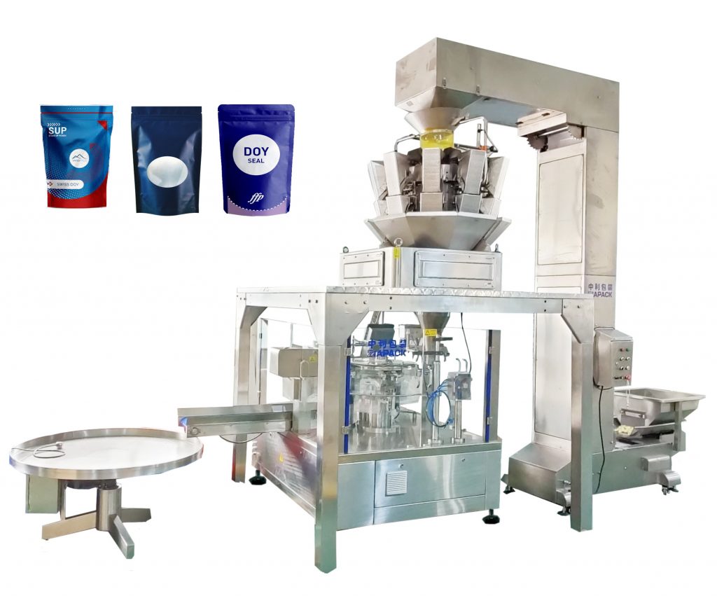 Pre-made pouch fill dan seal machine, terdiri dari 8 stasiun kerja efisiensi dan stabilitas, menekankan paket tas stand-up, tas ritsleting, tas corot, dan berbagai kantong pra-dibuat. Bekerja sama dengan sistem pemberian dosis yang berbeda (kombinasi penimbang / penimbangan linier / sekrup auger / pengisi piston) dan konveyor pengangkatan otomatis, ini secara luas diterapkan pada butiran, cairan, dan bubuk.